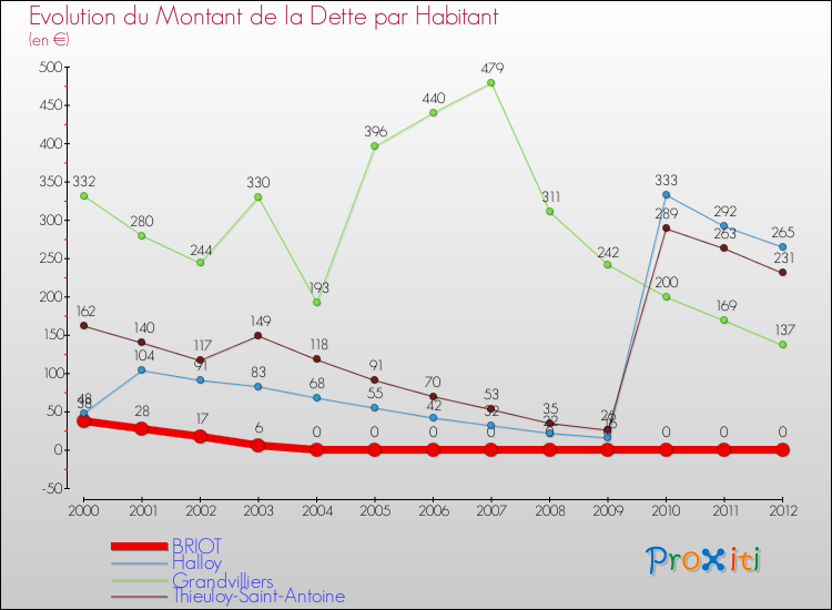 A noter : la valeur moyenne de la dette par habitant des communes françaises similaires à Briot était de 544 € par habitant, en 2012.