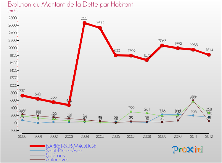 A Barret-sur-Méouge, la dette par habitant a donc augmenté de 148.49 % entre 2000 et 2012.