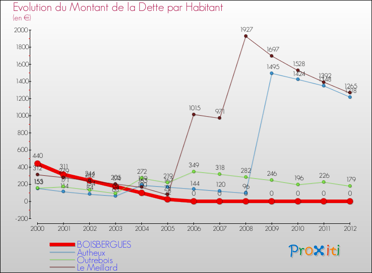 A Boisbergues, la dette par habitant a donc baissé de 100 % entre 2000 et 2012.