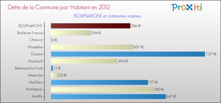 A noter : la valeur moyenne de la dette par habitant des communes françaises similaires à Bouffémont était de 881 € par habitant, en 2012.