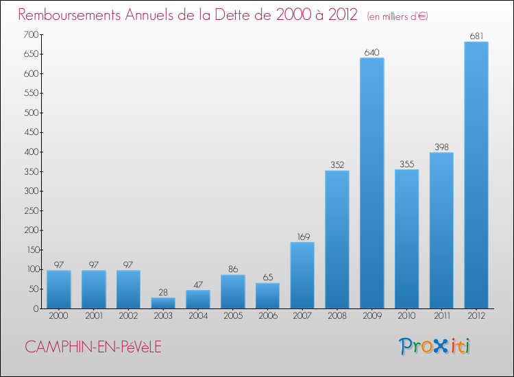 A Camphin-en-Pévèle, la dette par habitant a donc augmenté de 392.24 % entre 2000 et 2012.