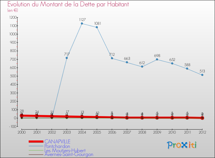 Pendant la même période, les communes françaises similaires à Canapville, ont vu leur dette par habitant augmenter de 24.08 % en moyenne entre 2000 et 2012.