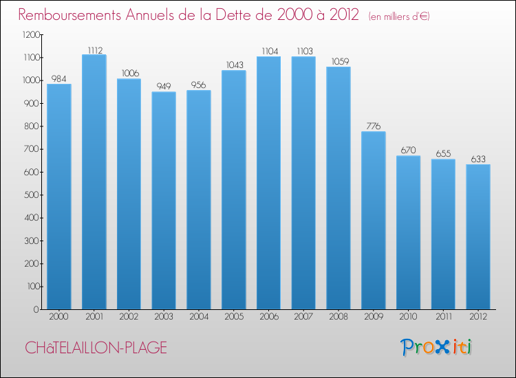 Par rapport aux 6214 habitants de Châtelaillon-Plage, en 2012 le poids de cette dette représente 671 € par habitant.
