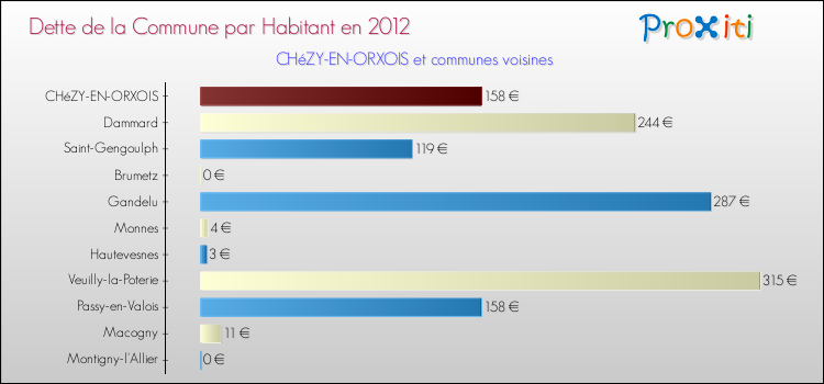 Par rapport aux 368 habitants de Chézy-en-Orxois, en 2012 le poids de cette dette représente 158 € par habitant.