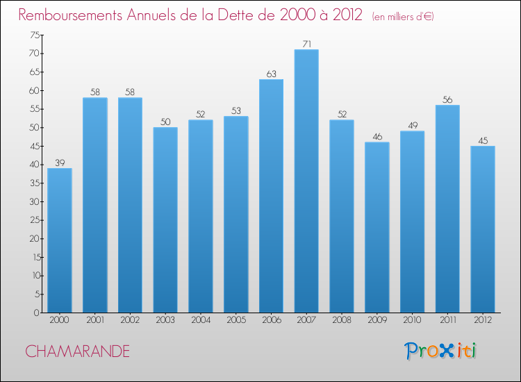 A Chamarande, la dette due par habitant de la commune en 2012 est donc moins élevée de 44.8 % que pour des communes similaires.