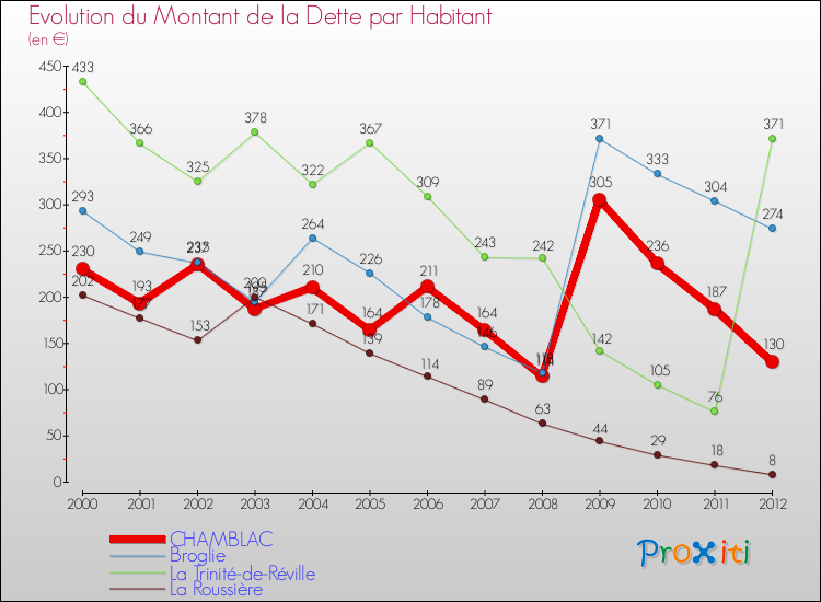 A Chamblac, la dette par habitant a donc baissé de 43.48 % entre 2000 et 2012.