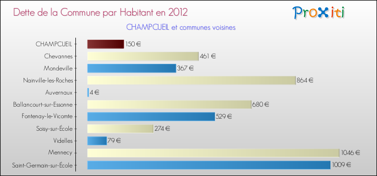 Comparaison de la dette par habitant de la commune en 2012 pour CHAMPCUEIL et les communes voisines