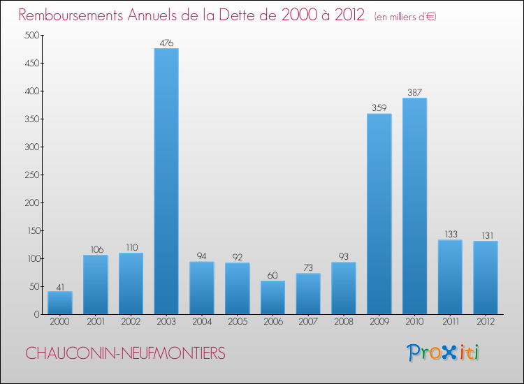 Par rapport aux 2738 habitants de Chauconin-Neufmontiers, en 2012 le poids de cette dette représente 630 € par habitant.