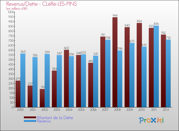 Comparaison Revenus/Dette de Cléré-les-Pins (de 2000 à 2012)