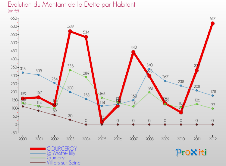 A Courceroy, ce montant de la dette est en augmentation de 94.59 % par rapport à 2011.