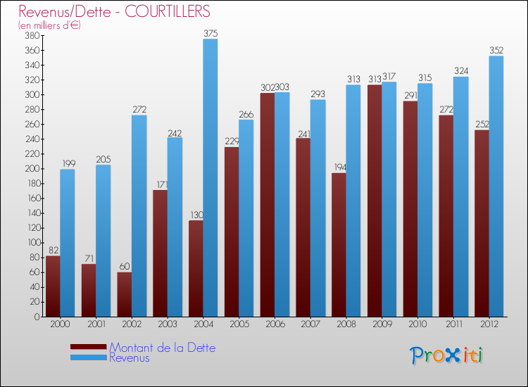 Comparaison Revenus/Dette de Courtillers (de 2000 à 2012)