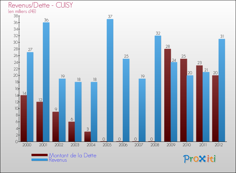 Comparaison Revenus/Dette de Cuisy (de 2000 à 2012)