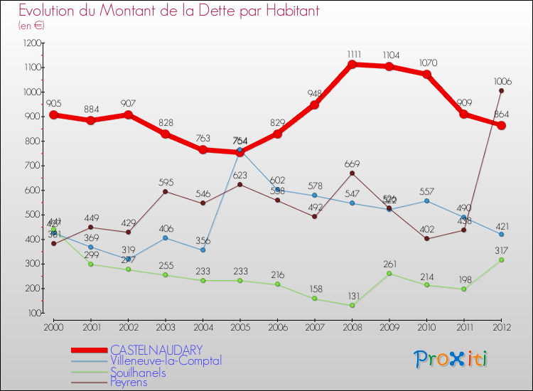 Pendant la même période, les communes françaises similaires à Castelnaudary, ont vu leur dette par habitant augmenter de 8.65 % en moyenne entre 2000 et 2012.