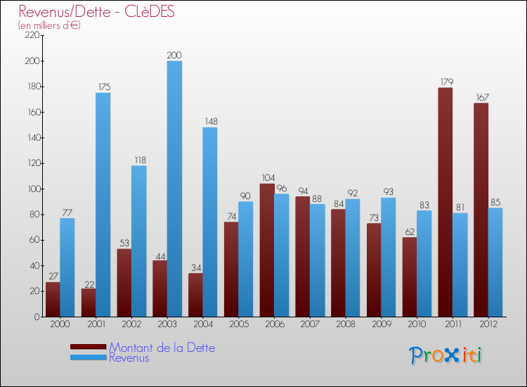 Comparaison Revenus/Dette de Clèdes (de 2000 à 2012)