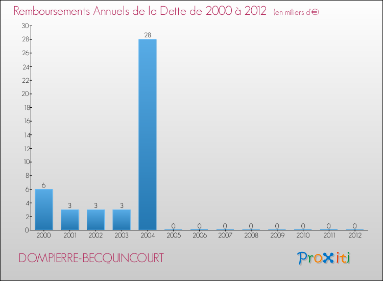 A Dompierre-Becquincourt, la dette par habitant a donc baissé de 87.5 % entre 2000 et 2012.