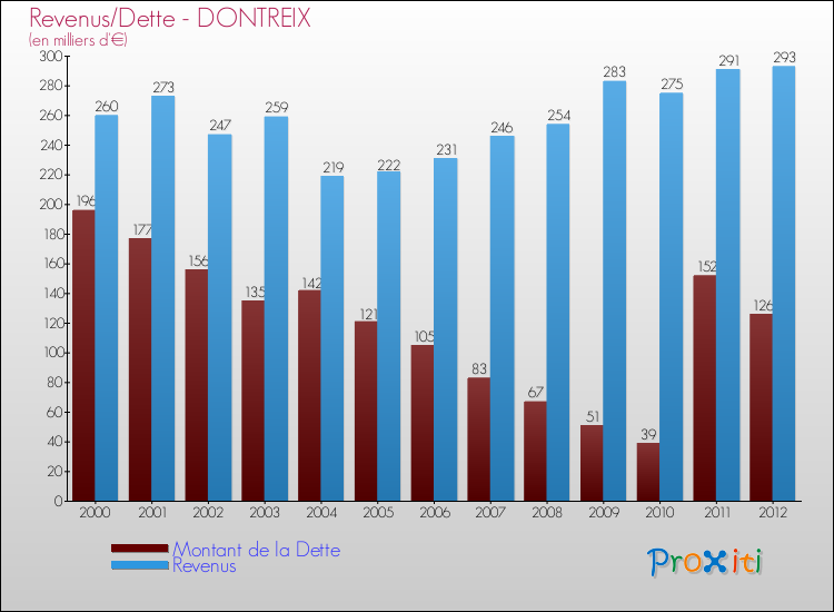 Par rapport aux 418 habitants de Dontreix, en 2012 le poids de cette dette représente 301 € par habitant.