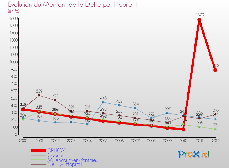 A Drucat, la dette par habitant a donc augmenté de 158.02 % entre 2000 et 2012.