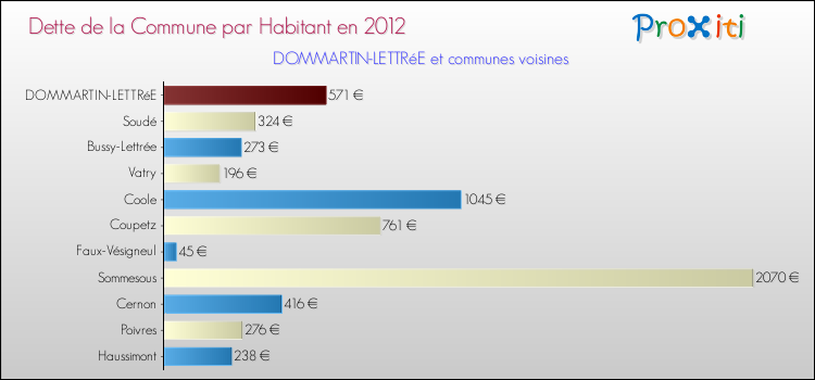 A Dommartin-Lettrée, la dette due par habitant de la commune en 2012 est donc plus élevée de 13.07 % que pour des communes similaires.