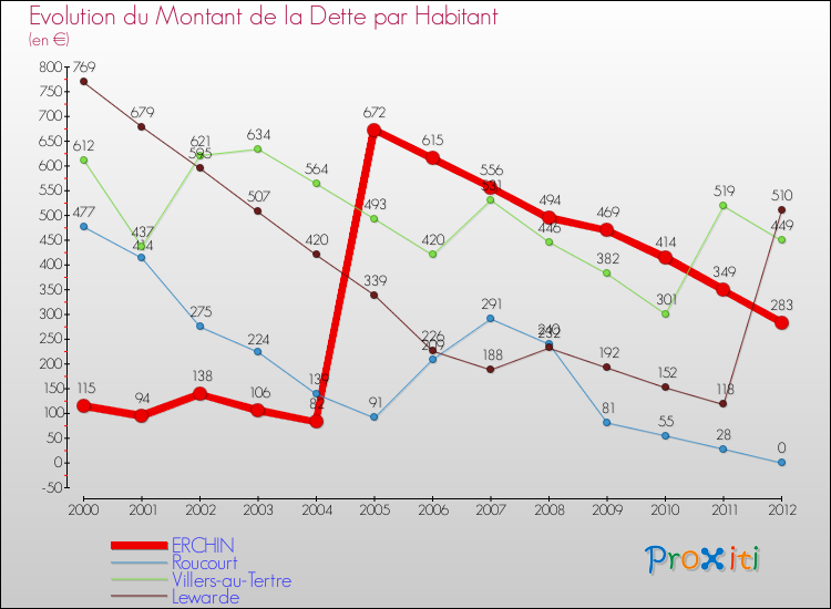 A Erchin, la dette par habitant a donc augmenté de 146.09 % entre 2000 et 2012.