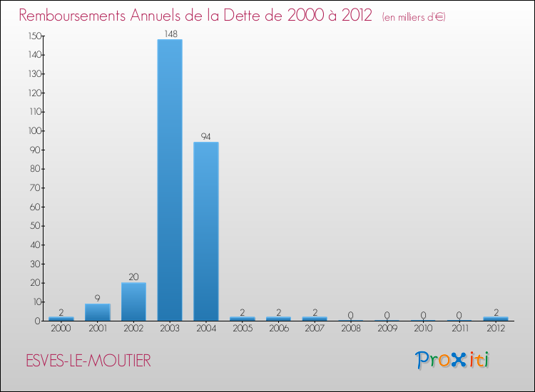 Par rapport aux 142 habitants de Esves-le-Moutier, en 2012 le poids de cette dette représente 33 € par habitant.