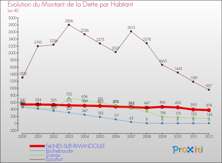 Pendant la même période, les communes françaises similaires à Félines-sur-Rimandoule, ont vu leur dette par habitant augmenter de 25.18 % en moyenne entre 2000 et 2012.