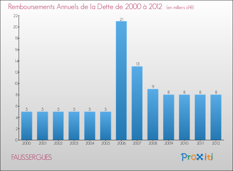 Pendant la même période, les communes françaises similaires à Faussergues, ont vu leur dette par habitant augmenter de 9.07 % en moyenne entre 2008 et 2012.