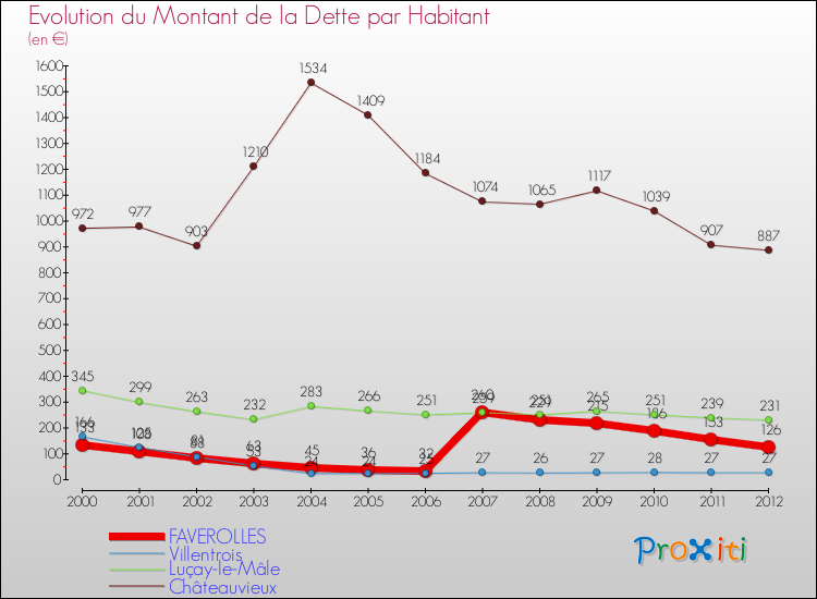 A Faverolles, la dette par habitant a donc baissé de 5.26 % entre 2000 et 2012.