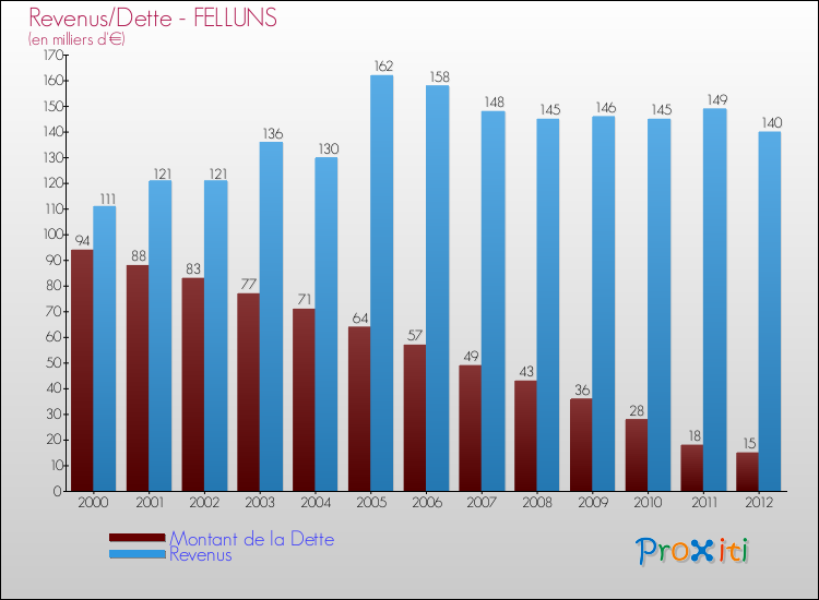 Comparaison Revenus/Dette de Felluns (de 2000 à 2012)