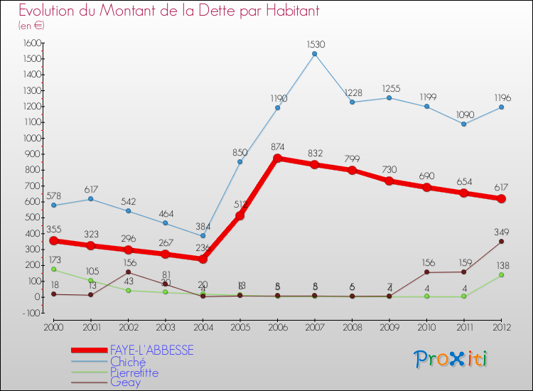 A Faye-l'Abbesse, la dette par habitant a donc augmenté de 73.8 % entre 2000 et 2012.