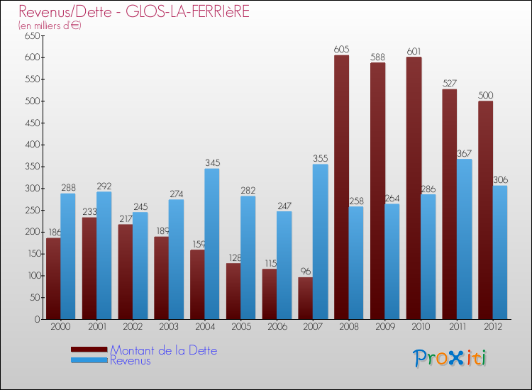 Comparaison Revenus/Dette de Glos-la-Ferrière (de 2000 à 2012)