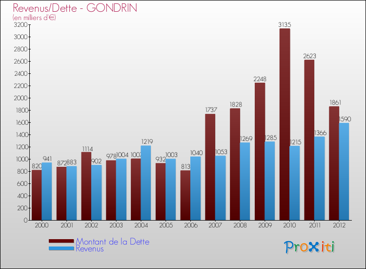 Comparaison Revenus/Dette de Gondrin (de 2000 à 2012)