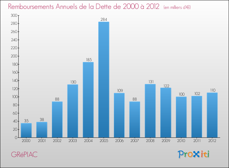 Par rapport aux 1003 habitants de Grépiac, en 2012 le poids de cette dette représente 865 € par habitant.