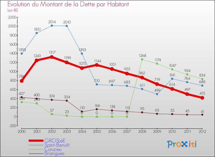 Pendant la même période, les communes françaises similaires à Groslée, ont vu leur dette par habitant baisser de 2.51 % en moyenne entre 2000 et 2012.