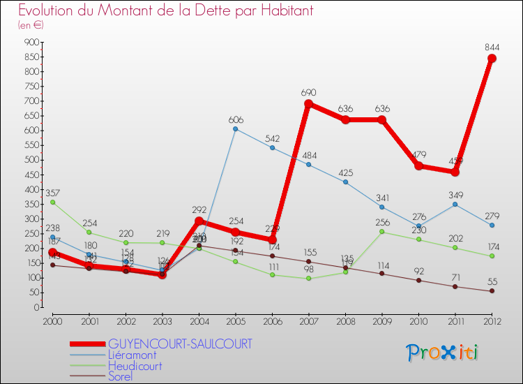 Par rapport aux 129 habitants de Guyencourt-Saulcourt, en 2012 le poids de cette dette représente 844 € par habitant.