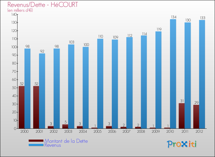 Comparaison Revenus/Dette de Hécourt (de 2000 à 2012)