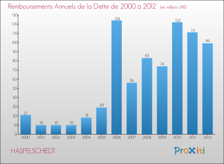 Par rapport aux 285 habitants de Haspelschiedt, en 2012 le poids de cette dette représente 2699 € par habitant.