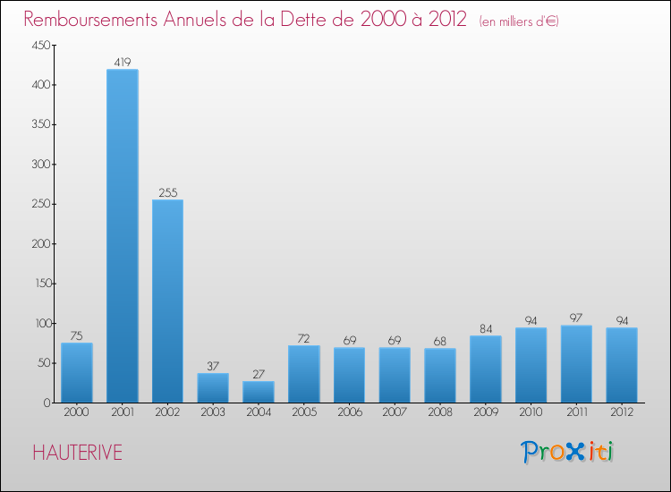 Par rapport aux 1138 habitants de Hauterive, en 2012 le poids de cette dette représente 428 € par habitant.