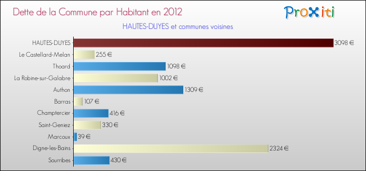 A Hautes-Duyes, la dette due par habitant de la commune en 2012 est donc plus élevée de 513.47 % que pour des communes similaires.