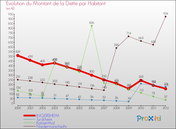 Comparaison de la dette par habitant de la commune en 2012 pour INGERSHEIM et les communes voisines