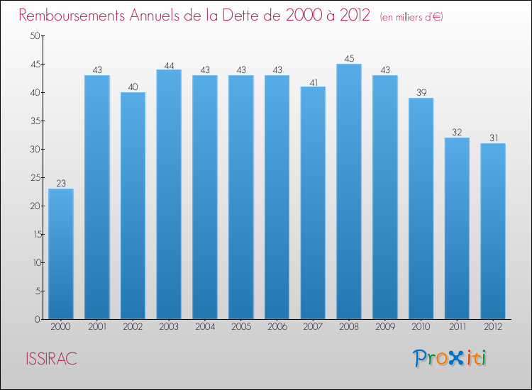 A Issirac, la dette par habitant a donc baissé de 54.22 % entre 2000 et 2012.