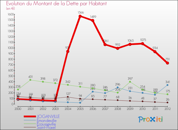 Par rapport aux 80 habitants de Joganville, en 2012 le poids de cette dette représente 731 € par habitant.
