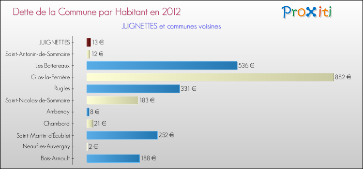 A Juignettes, la dette due par habitant de la commune en 2012 est donc moins élevée de 97.43 % que pour des communes similaires.