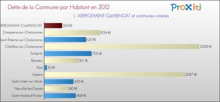 A L' Abergement-Clémenciat, la dette due par habitant de la commune en 2012 est donc moins élevée de 60.09 % que pour des communes similaires.