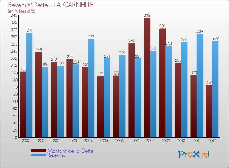 Comparaison Revenus/Dette de La Carneille (de 2000 à 2012)