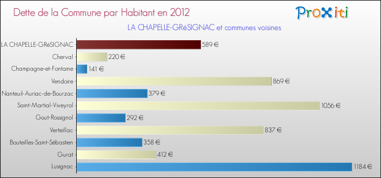 A La Chapelle-Grésignac, la dette due par habitant de la commune en 2012 est donc plus élevée de 16.63 % que pour des communes similaires.