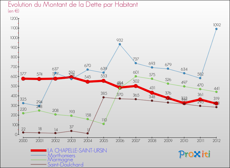 Pendant la même période, les communes françaises similaires à La Chapelle-Saint-Ursin, ont vu leur dette par habitant baisser de 2.98 % en moyenne entre 2000 et 2012.