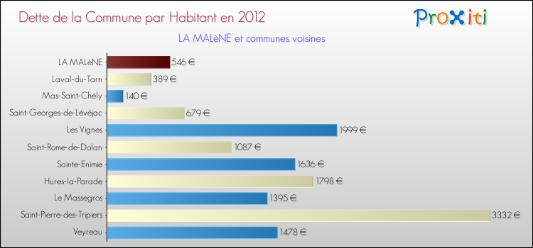 A noter : la valeur moyenne de la dette par habitant des communes françaises similaires à La Malène était de 505 € par habitant, en 2012.