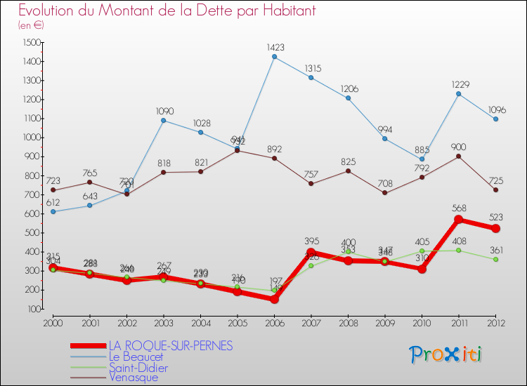 Pendant la même période, les communes françaises similaires à La Roque-sur-Pernes, ont vu leur dette par habitant baisser de 10.75 % en moyenne entre 2000 et 2012.