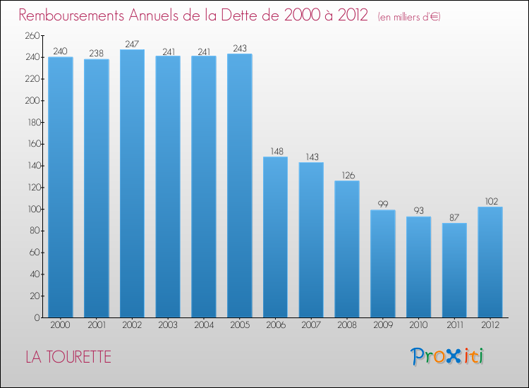 A La Tourette, la dette par habitant a baissé de 12.86 % entre 2008 et 2012.
