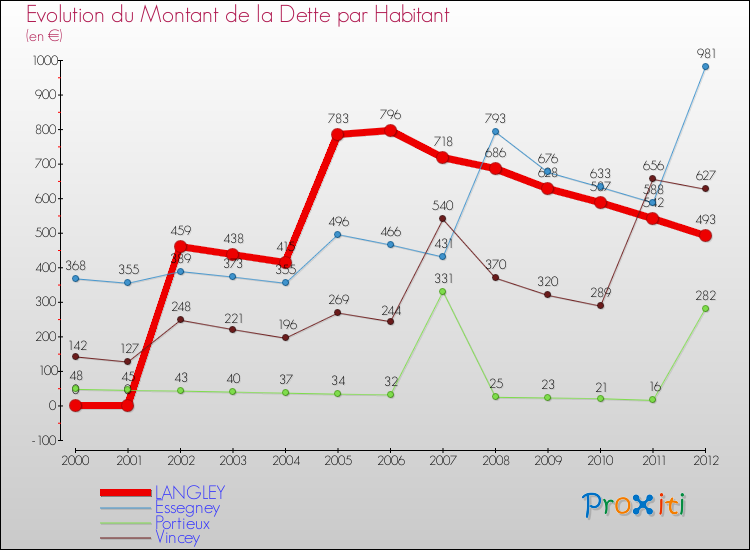 A noter : la valeur moyenne de la dette par habitant des communes françaises similaires à Langley était de 596 € par habitant, en 2012.